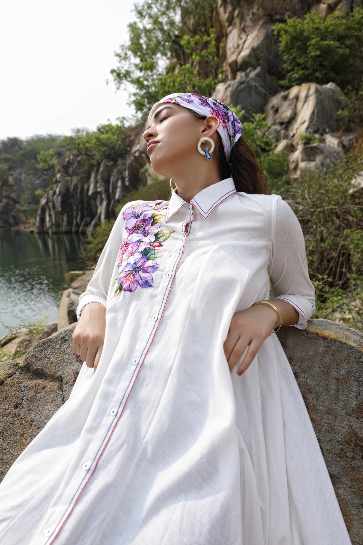 This shirt maxi dress features a stunning purple ombre dip-dye effect, with floral appliqué work on the shoulder and minimal thread detailing across the collar, front and cuff. The stylish yet comfortable silhouette makes it a perfect choice for your summer holiday and casual outings.