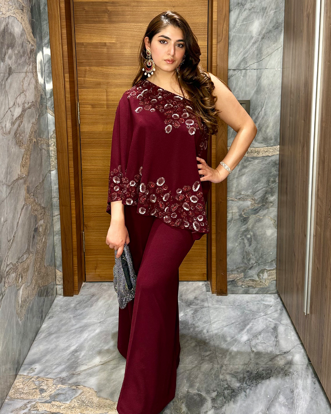 One shoulder maroon Co-ord set