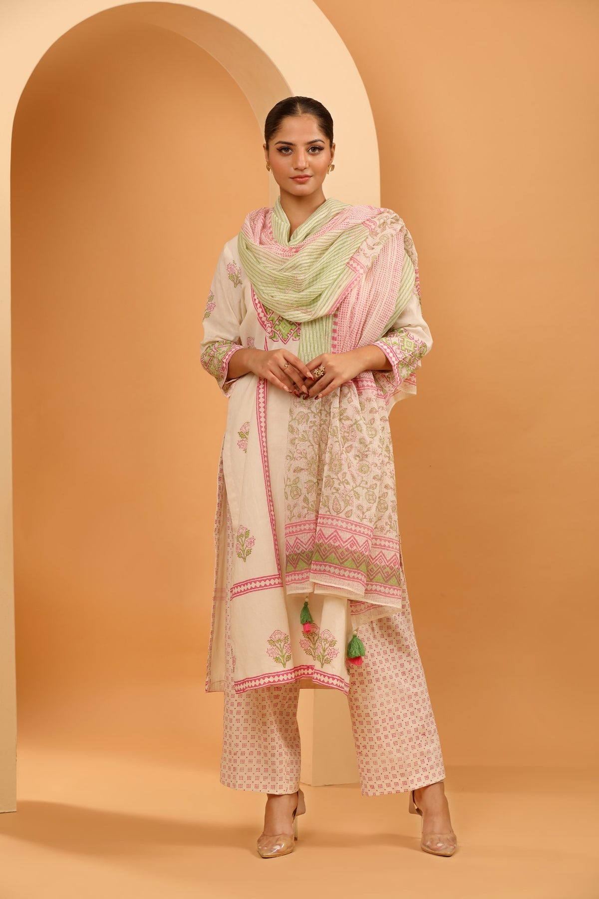 Fresh summer vibes with our Spring Blush kurta set — ivory round neck kurta detailed with green and pink block prints, paired with a tassel-trimmed dupatta and straight block-printed bottoms. Bright and bold, yet beautifully traditional season favourite.