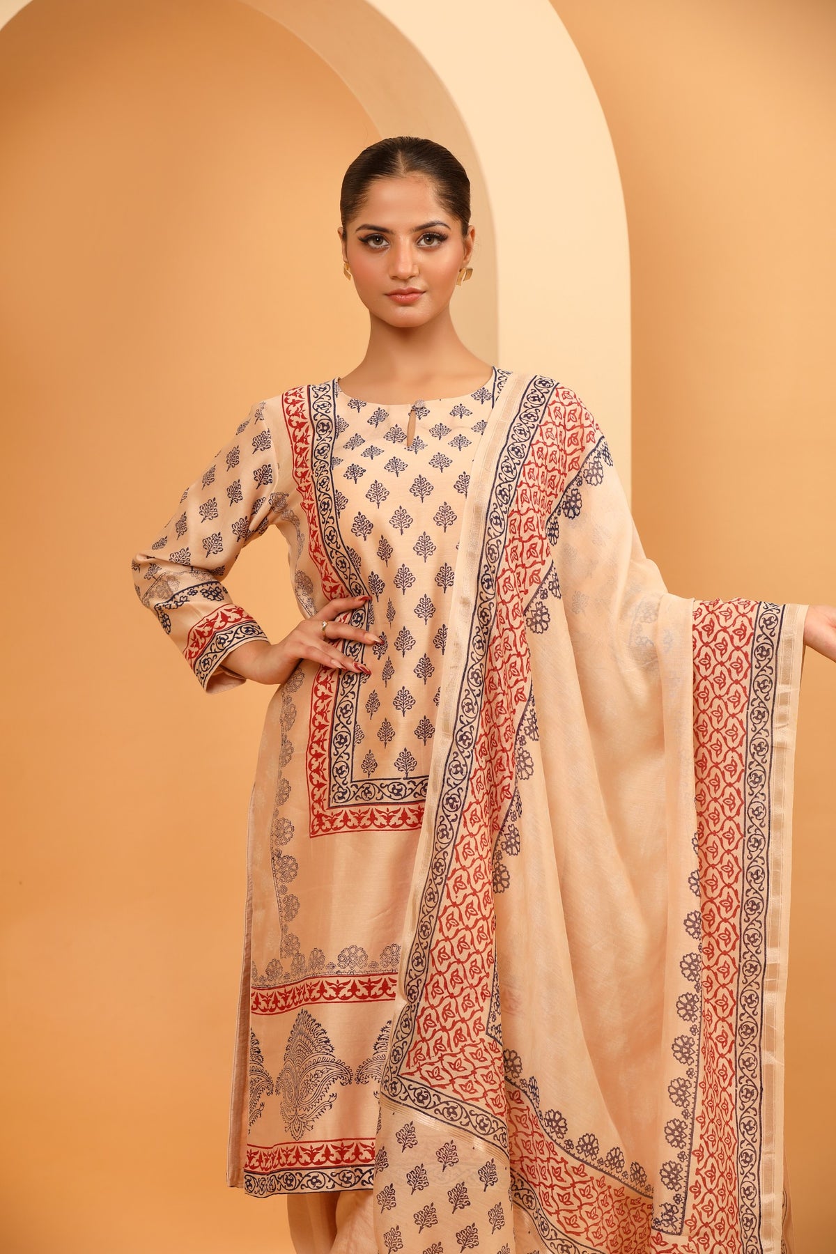 Shine in serenity this summer with our beige kurta set featuring intricate navy blue and red block printing. The set includes a round neck shirt with detailed neckline, straight bottoms and a matching dupatta - a go to outfit for the season.