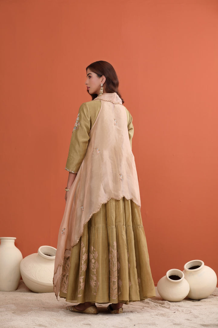 Crafted from pure Chanderi fabric, this Olive Green and Peach Anarkali set exudes elegance and sophistication. The Anarkali dress is adorned with intricate gold block print and detailed hand embroidery. Paired with it is a jacket tailored to perfection, featuring scalloped edges and overall embroidery, creating an elegant  and contemporary aesthetic.